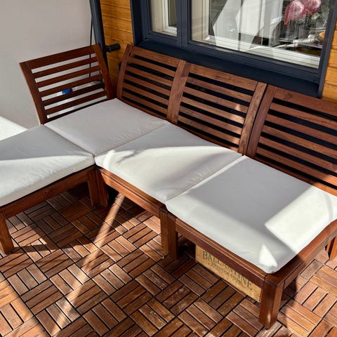 Ikean Havsten sohva. Käsinojien lisäksi yksi ns käsinojaton reunapala, jonka voi laittaa joko oikealle tai vasemmalle puolelle. Toisessa käsinojapalassa pieni naarmu. (näkyy viimeisessä kuvassa) Käytetty lasitetulla parvekkeella eli on ollut suojassa sateelta tms.