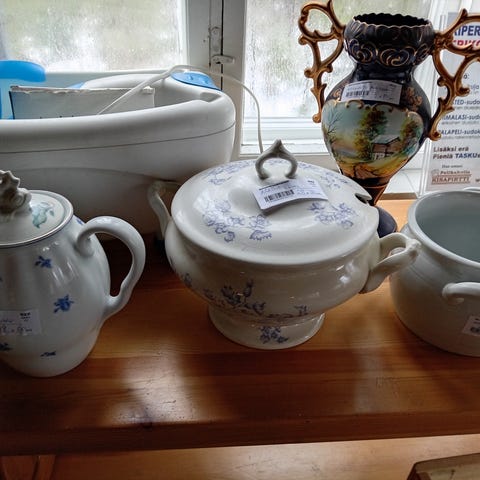 Nämä kuvassa olevat astiat ovat Arabian valmistama Pirtti-sarjan kahvikuppeja ja aluslautasia.