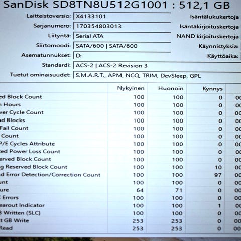 Soveltuu esimerkiksi kannettaviin ja pöytätietokoneisiin, joissa on 2,5 tuuman SATA-paikka. Kuvissa näkyy levyn käyttötuntimittari.