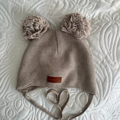 Myydään 2-6kk vauvan puuvillapipo karvatupsulla. Metsola. Väri vaalea oranssi/haalea pinkki/nude. Vähän käytetty, hyvä kevät pipo