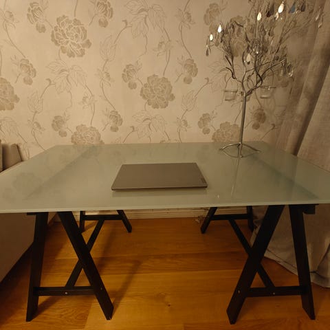 Tyylikäs pöytä mustalla kannella ja 2 saman tyylin tuolia. 120*75 cm. Kaukajärvellä.