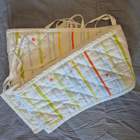 Alvi-merkin pehmeä ja hyväkuntoinen reunapehmuste pinnasänkyyn. Puuvillaa. Kiinnitetään pinnoihin solmimisnauhoilla. Koko noin 360cm×24cm. Puhdas ja siisti. Rauhoittavan värinen, kaunis kuosi. Toinen puoli pääasiassa valkoinen, toinen ruskeanharmaa "taupe".