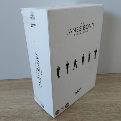 007 James Bond elokuvakokoelma DVD-levyinä metallirasiassa. Kokoelma sisältää useita James Bond -elokuvia yksittäisinä DVD-koteloina, jotka on pakattu vaaleaan 007-logolla varustettuun metallirasiaan. Soveltuu DVD-soittimelle ja elokuvien keräilyyn. Rasia toimii samalla säilytyslaatikkona levyille.