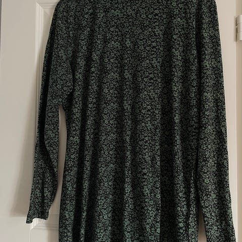 Puserossa on sinisävyinen, kirjava kuosi ja pitkähköt hihat. Pyöreä pääntie.