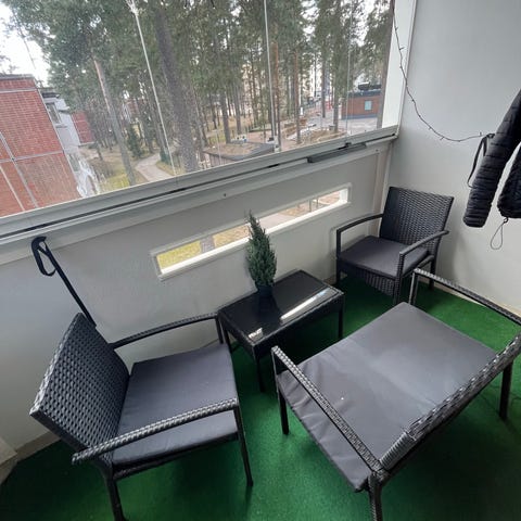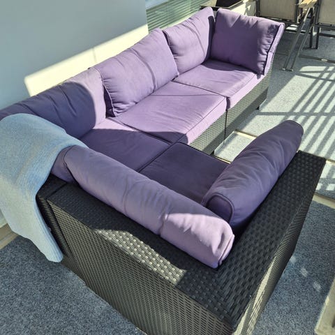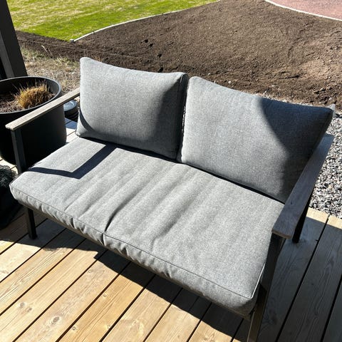 Myydään parveke/terassisohva, kaksi irrotettavaa moduulia. Käytetty kunto, mutta ehjä. Kuvassa näkyy heijastumat parvekkeen lasista, siksi näyttää epätasaiselta istuintyynyjen väri.