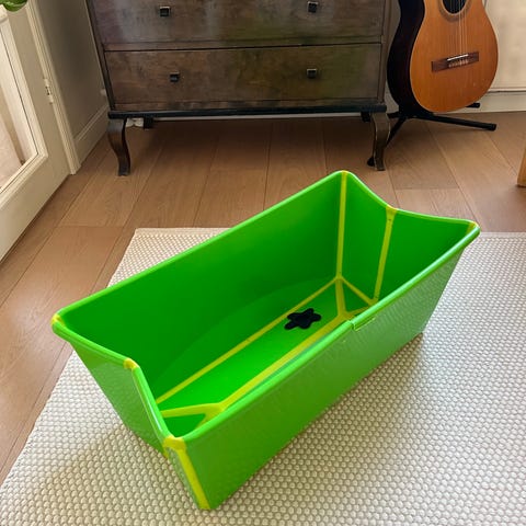 Stokke Flex Bath vauvan kylpyamme ja kylpytuki. Vihreät saumat muuten läpinäkyvä. Ollut yhdellä lapsella harvakseltaan käytössä. Hieman naarmuja pohjassa, mutta ei mitään kovin näkyvää tai käyttöön vaikuttavaa.
