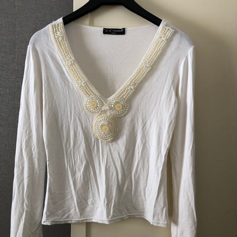 Ihana valkoinen kesätoppi jossa mustia ja kultaisia yksityiskohtia. Yläosassa röyhelöä. Kysy lisää!