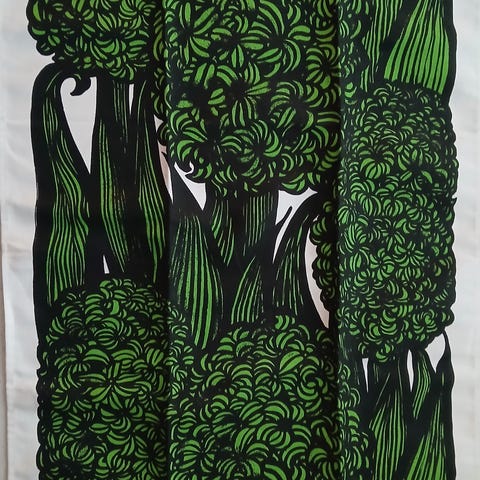 Anneli Qveflanderin Marimekolle vuonna 1968 suunnittelema vihreä “Hyasintti” -kangas. Teksti: Marimekko Oyj Suomi-Finland Anneli Qveflander 1968 “Hyasintti” 100 % Co + pesumerkinnät.