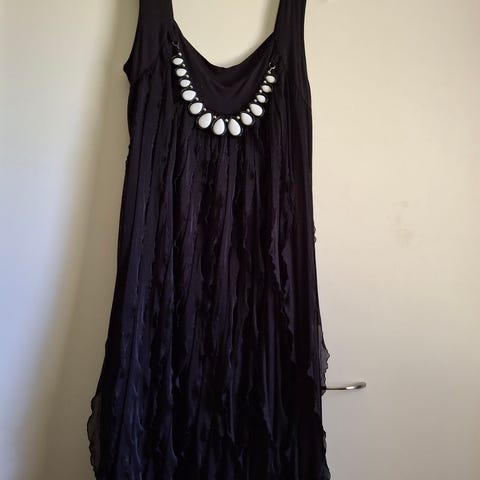 Kaksikerroksinen, kirjailtu mekko läpikuultavaa, joustavaa materiaalia. Alla läpinäkymätön hihaton, spagettiolkaimellinen putkimekko. Pituus edestä helmaan 80 cm.