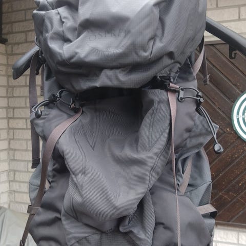 Kunnoltaan reppu on hyvä. Kankaassa ei ole reikiä, eikä missään saumassa repeämiä. Kaikki nauhat ja klipsit ehjiä. Ospreyn logo on kuitenkin matkan varrella kulunut johonkin, kuten kuvassa näkyy.