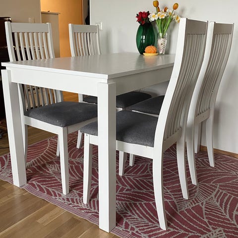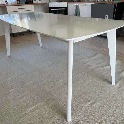 Annetaan korkeakiiltoinen valkoinen ruokapöytä koko 140x80. Kolhuja muutama, isoimmasta kuva. Nouto kuhankoskelta