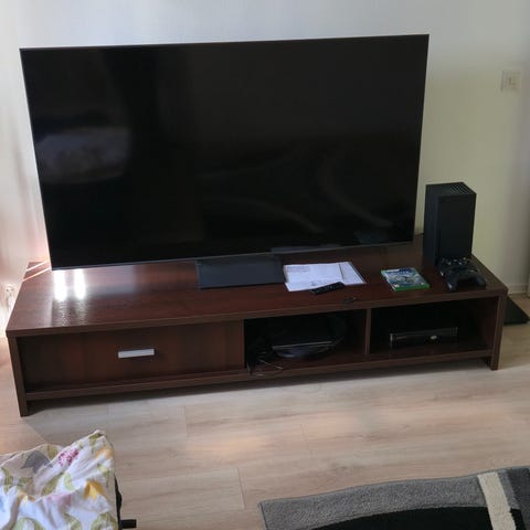 Kokopuinen TV taso, jossa kansi loimukoivusta. Käytön jälkiä. Kaksi hyllylevyä, joista pidikkeet toiselle puuttuu.