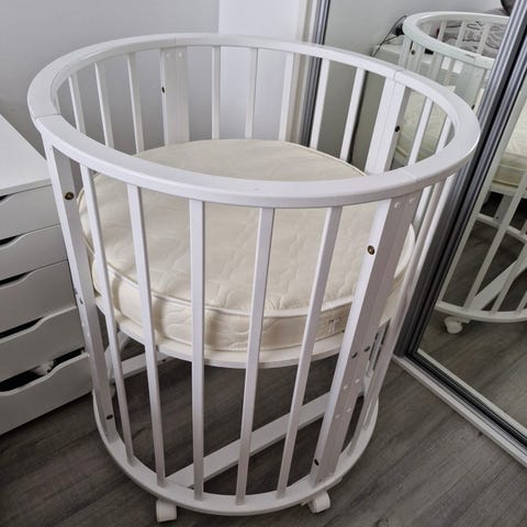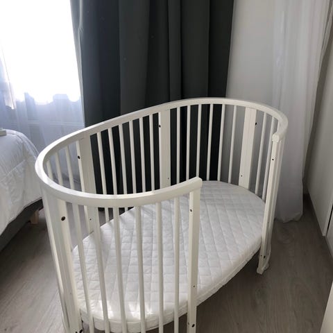 Stokke pinnasänky, väri valkoinen. Sängyssä on ovaalinmuotoinen runko ja säleikköreunat. Materiaali on maalattua puuta. Kuvissa näkyy käytön jälkiä ja maalipinnan kulumaa reunoissa. Soveltuu vauvalle ja taaperolle, lisää osia löytyy :)