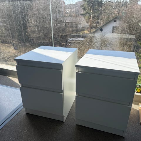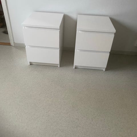 Kaksi mustaa yöpöytää. Ulkoisesti vasemmanpuoleinen siisti eikä oo jälkeä,mutta alemmassa laatikossa pientä kupruilua (näkyy yhdessä kuvista) oikeanpuoleinen yöpöytä laatikot kunnossa,mutta päällä näkyy pientä jälkeä mikä tullut vedestä. Toimivat vetolaatikot molemmissa.