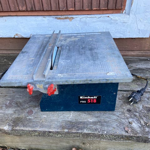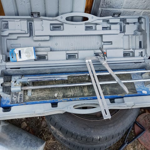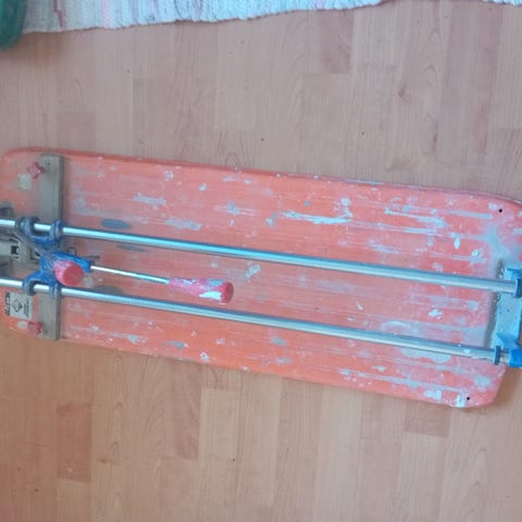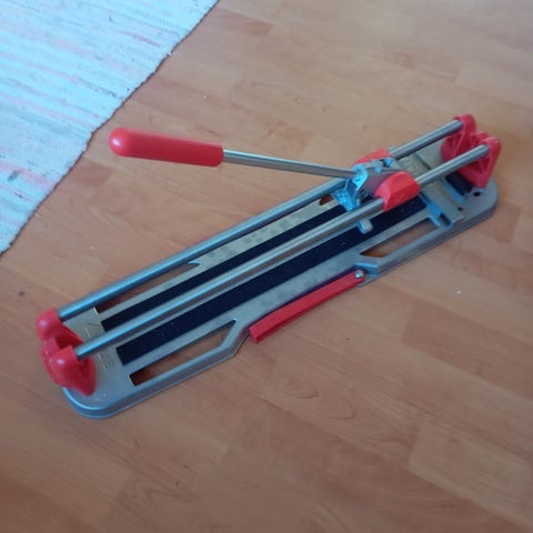 Käsikäyttöinen laattaleikkuri laattojen leikkaamiseen. Kahden keittiön välitilan laatoituksessa käytetty aika uuden veroinen leikkuri. Biltemasta hommattu aikanaan ja hyvin toiminut.