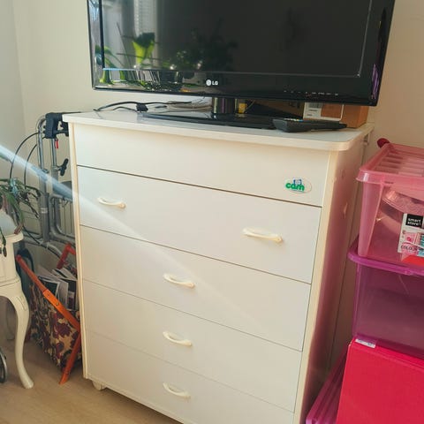Myydään valkoinen lipasto, reilusti säilytystilaa (kuva).