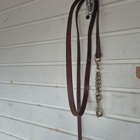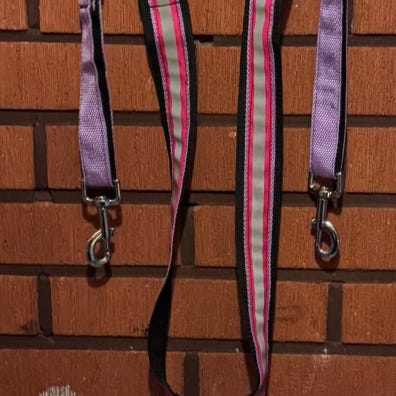 Hepan talutushihna, jossa pehmustettu pinkki-musta käsilenkki ja metallinen ketjuosa. Hihnassa on metallinen lukko kiinnitystä varten.