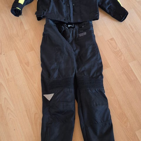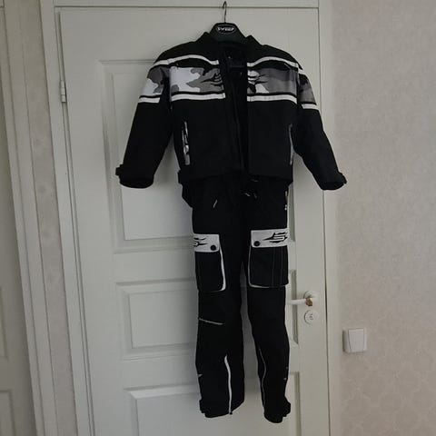 messä Windtex, josta hieman nimen lanka rispaantunut. Takissa selässä tuki, samoin olkapäissä ja kyynärpäissä. Housuissa tuki polvissa. Vetoketju molemmissa lahkeissa. Vaikka housuissa on nepparit, niin eivät ole kiinnitettävissä takkiin.