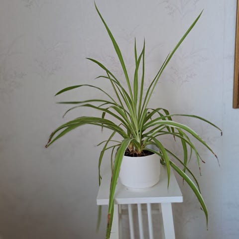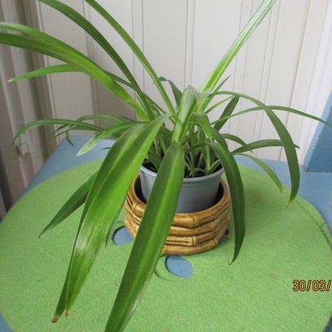 Rönsylilja viherkasvi muoviruukussa. Pitkät, kapeat vihreät lehdet, joissa vaaleammat keskiosat. Sopii sisätilojen huonekasviksi esimerkiksi pöydälle tai kukkajakkaralle. Kasvi kuvassa vaaleassa ruukussa. Vain nouto.