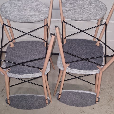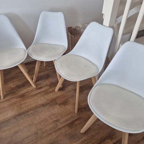 Ruokatuolit hyvässä kunnossa, yhdessä pehmusteessa näkyy pieni sinertävä jälki ja pehmusteet muuten ehjiä.