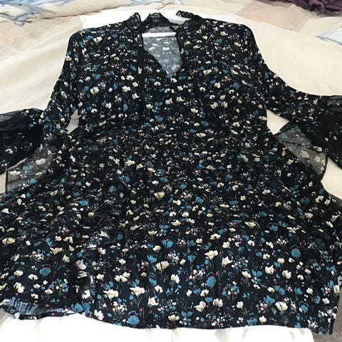 Vuorellinen mekko, jossa kiristysnauhat hihoissa