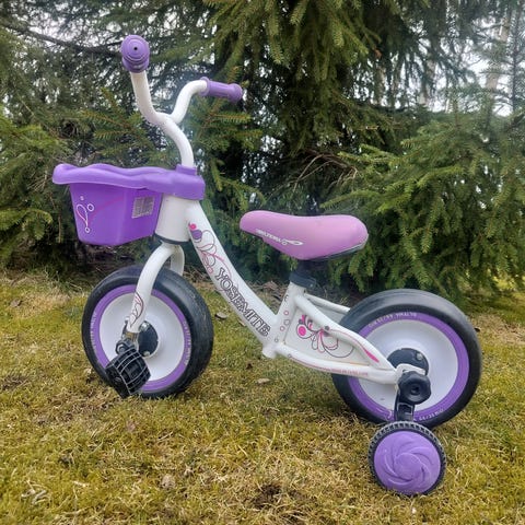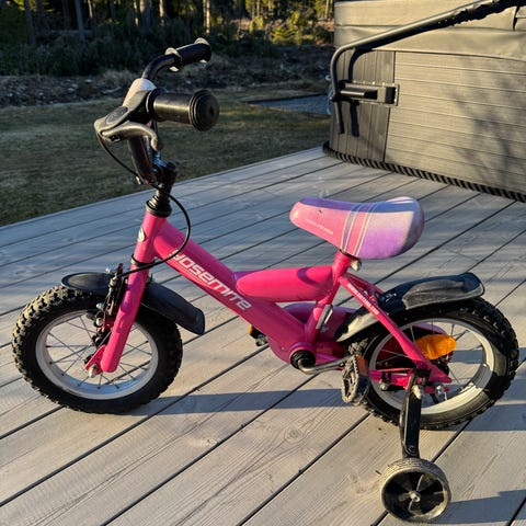 Crescent lastenpyörä 12" renkailla. Pyörässä on apupyörät ja työntöaisa aikuisen ohjausta varten. Runkoväri on vaaleanpunainen ja satula sekä ohjaustanko ovat mustat. Sopii pienelle lapselle ensimmäiseksi polkupyöräksi, kun siirrytään potkupyörästä polkimelliseen pyörään.