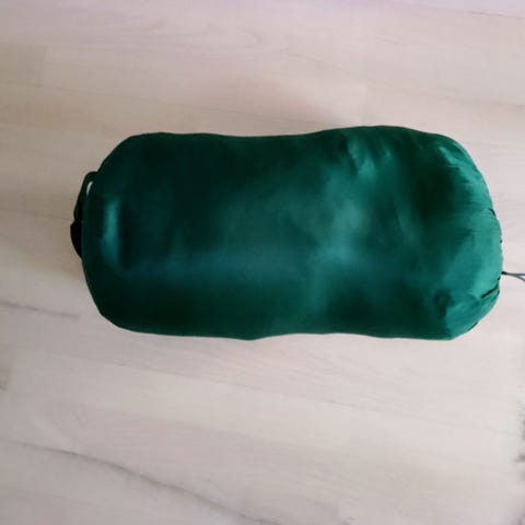 Vihreä makuupussi keltaisessa säilytyspussissa. Makuupussi voidaan pakata pieneen tilaan säilytyspussin avulla kuljetusta varten.