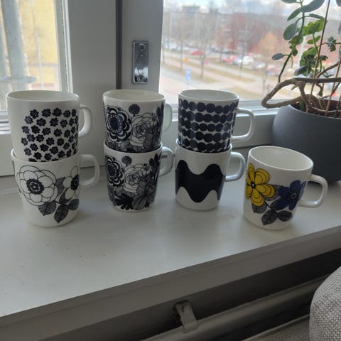 Marimekon kahvi kupit. Muiden ohella muutamasti käytetty. Valo heijastuu kuvissa, ei ole naarmuja Yht 20