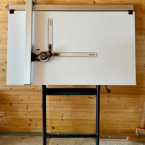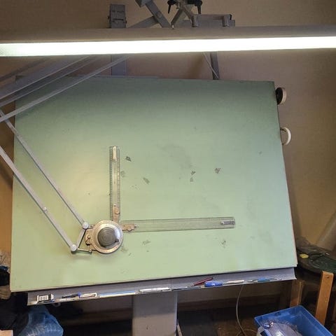Koko (110 * 170) cm . Korkeussäätö kaasulla polkimesta. Pöytä kääntyy sekä vaaka ,että pystyasennossa. Tukeva runko, liikkuu pyörillä. Piirustuskone lukittuu , liikkuu vaaka- ja pystyasennossa, myös viivaimet 0 - 180 * välillä pystyvää. Painava, koje irrotettavissa, kuin myös lauta jälkeisestä.