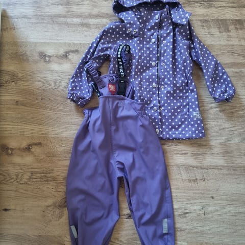 Name it sadeasu tytöille, koko 98. Violetti kaksiosainen sadeasu, jossa takki hupulla ja henkselilliset sadehousut. Materiaali polyesteriä. Hihansuissa ja lahkeissa on kuminauhat istuvuuden parantamiseksi. Asussa on heijastinyksityiskohtia näkyvyyden lisäämiseksi. Sopii käytettäväksi sateisella säällä ulkoleikkeihin ja arkeen.