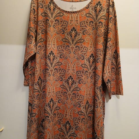 Naisten paita, koko XL. Tunika on kuosiltaan kukkakuvioinen, väreinä oranssi ja musta. Malli on väljä ja pituudeltaan lantiolle tai hieman sen alapuolelle ulottuva. Hihapituus on noin 3/4. Materiaali vaikuttaa pehmeältä ja joustavalta trikoolta tai vastaavalta neulokselta. Sopii arki- ja vapaa-ajan käyttöön.