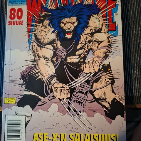 Marvel Wolverine sarjakuvalehti, hyvä paitsi myyntitarra kannessa.