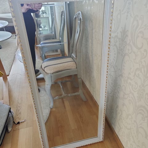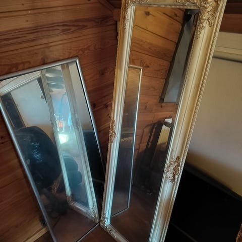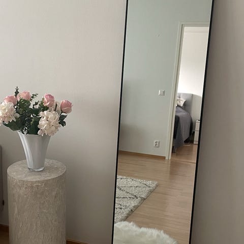 Kokovartalopeili 196cm x 66cm, jossa kapea hopeanvärinen kehys. Peili on korkea ja sopii hyvin makuuhuoneeseen tai vaatehuoneeseen pukeutumispeiliksi.