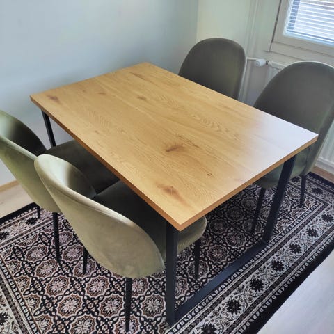 Todella näpsäkkän näköinen ruokailu ryhmä,pieneen kotiin. On jämäkkä ja hyvä kuntoinen pöydässä vähäisiä käytön jälkiä. Tuolit ovat kuin uudet.Laadukas setti edullisesti.