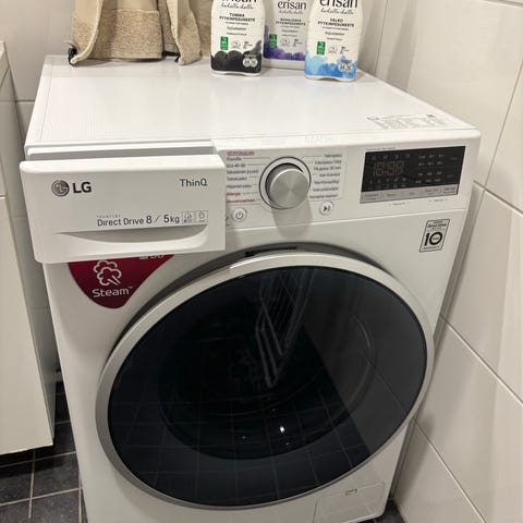 LG edestä täytettävä pesukone, kapasiteetti 8 kg. Koneessa on useita pesuohjelmia, kuten puuvilla, synteettiset, villa, käsinpesu, pikaohjelma, allergiaohjelma ja rummun puhdistus. Ostettu 3 v. sitten uutena Gigantista. Siisti ja hyvässä kunnossa. Toimii moitteettomasti.