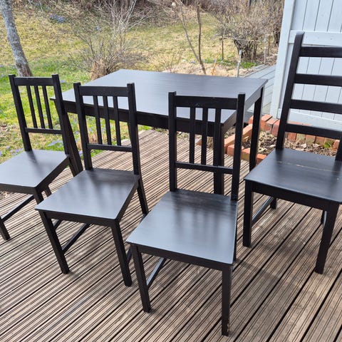 Myydään Ikeasta ostettu ruokapöytä sekä 5 kpl koivuisia tuoleja (ei ikeasta). Oman, heikoksi jääneen maalausyrityksen jälkeen kulumia sekä tuoleissa että pöydässä, en jokaista tuolia kuvannut erikseen. Tuolien ja pöydän kunto hyvä, kohtalainen laitettu epäsiistin ulkoasun vuoksi. Käytössä toimii sellaisenaan, mutta maalaamalla/kunnostamalla saa varmasti siistin kokonaisuuden.