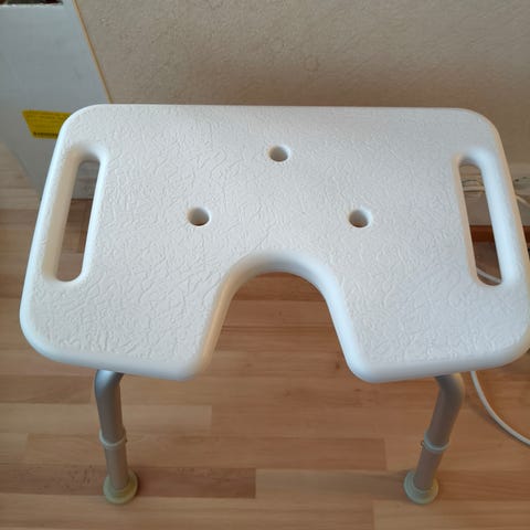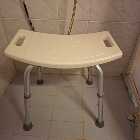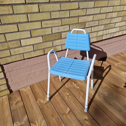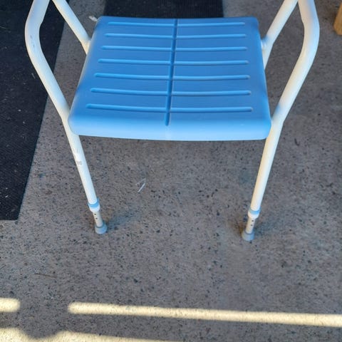 Hyväkuntoinen suihkutuoli selkänojalla ja säädettävillä jaloilla. Nouto.