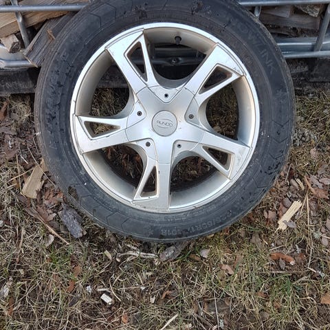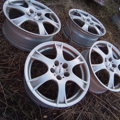 Yhdessä vanteessa lähtenyt maali vähän, rajun näköinen kun ottaa syliin mutta auton alla ei paljon huomaa.
