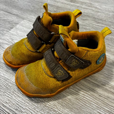 Kuvan kengät seuraavalle temuajalle. Näitä on innolla käytetty: kangas on kulunut erityisesti sisäsyrjiltä ja kielen/läpän seutuvilta. Käytönjäljet "esteettisiä" ja näkyvät kuvissa, eivät vaikuta itse käyttöön. Ehjät pohjasta - sisältä ja ulkoa. Tarrat pitävät.