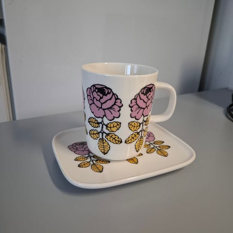 Marimekko kuppi ja lautanen korkkikannella valkoinen