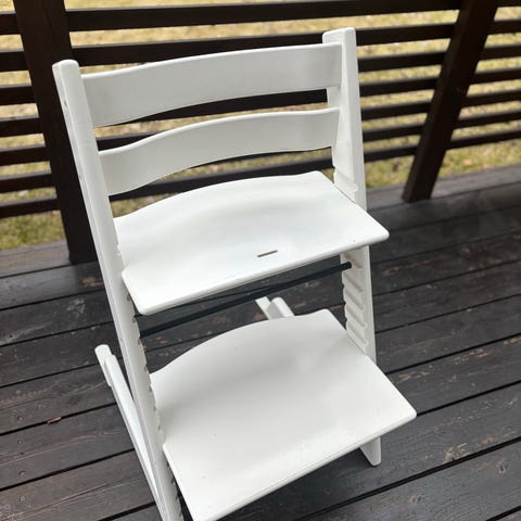 Stokke Tripp Trapp syöttötuoli. Materiaalina puu, väriltään pyökki. Tuolissa on säädettävä istuin- ja jalkataso, jotka voidaan asettaa eri korkeuksille ja syvyyksille lapsen koon mukaan. Sopii käytettäväksi ruokapöydän ääressä ja muuna istuimena lapselle. Klassinen mallinen syöttötuoli, joka voidaan mukauttaa kasvavalle lapselle siirtämällä tasoja ylemmäs tai alemmas.