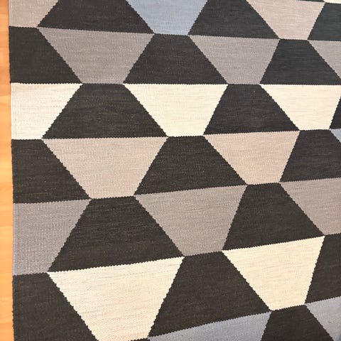Finarten Origami recycled cotton rag rug blue 160x230cm. Matto on käytännössä uusi, ollut lattialla pari viikkoa ja laputkin vielä kiinni. Ei vaan sopinutkaan meidän asuntoon.
