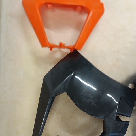Moottoripyörän etuvalo oransseilla ja mustilla muovikuorilla. Valoyksikkö sisältää kirkkaan lasin/muovin, heijastimen ja polttimolle tarkoitetun kannan. Takapuolella näkyvät kiinnityspisteet, johdotus ja liitin. Sopii moottoripyörän tai mahdollisesti enduro-/crossipyörän etuvaloksi, kun kiinnityskohdat ja sähköliitännät vastaavat omaa ajoneuvoa.