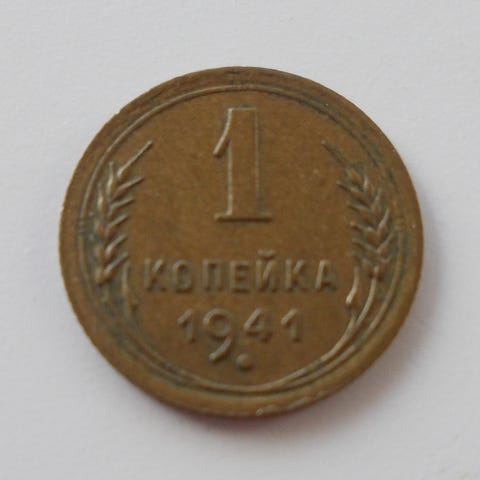 “Country USSR Denomination 1 kopek Year 1937-1946 Period Soviet Union (1924 - 1958)Coin type Circulation coins Composition Aluminium-Bronze”