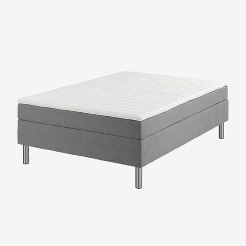Jysk sänky harmaalla verhoilulla ja metallijaloilla. Runko verhoiltu kankaalla. Sängyn mitat 140x200.