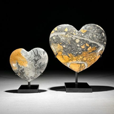 Upea pari keltaista maligano jasper - sydämen muotoista ja palloa omilla telineillään.Maligano jasper on tietty jasperi lajike, jota löytyy Indonesiasta ja joka muodostuu muinaisissa vulkaanisten kuumien lähteiden alueilla. Maligano tunnetaan kontrastisista lämpimistä sinisen ja harmaan sävyistä sekä upeista brecciated- eli rikottujen ja parhaiten parantuneiden kuvioiden, lisäksi hauskoista dendriittisistä kuvioista, jolloin kivi usein näyttää joen maisemaa pienten pensaiden ja solinajoen varrella.LÄHETETTÄVÄN SIJAINTINMITTAA, mukaan lukien teline: # Sydämen muotoinen--> Korkeus: 13,2 cm, Leveys: 11,5 cm, Pituus: 6 cm # Pallo --> Korkeus: 14 cm, Halkaisija: 6,5 cm VAROITUKSET: > Huomioithan, että nämä kuvat on otettu pimeässä studion tilassa, värimuutokset voivat vaihdella ympäristön mukaan.> Yksi tai useampi kuva esittää tyyliteltyä vastaavan tuotteen represented representation. Tarkat tiedot myynnissä olevasta tuotteesta löytyvät muista kuvista. Mikä tahansa tyylitellyssä valokuvassa esitetty tuote ei sisälly myyntiin.> MAINITTU PAINO MUKAAN MAHDOLLISTA TARKOITUSTA ON SISÄLTÄEN PAKKAUSMATERIAALIN.TOIMITUS- Tavara toimitetaan Track & Trace -koodilla DHL Parcelin, DPD:n tai postNin kautta. Seurantaa päivitetään Catawiki-lotissasi, kun paketti on jätetty postiin. - Tarkista säännöllisesti, jotta pakettisi ei palaisi meille, jolloin ostaja vastaa toisen lähetyksen toimituskuluista.- Seurantaa Espanjaan ja Portugaliin varten käytä tätä linkkiä ja lisää Catawiki-lotin seurantanumero https://clientesparcel.dhl.es/LiveTracking/Home- ME EI YHDISTÄ TOIMITUKSIA! - Jos sinulla on kysyttävää paketistasi, ota yhteyttä Catawiki-viestipalvelun kautta. Vastamme yrittäen 3 työpäivän kuluessa.
