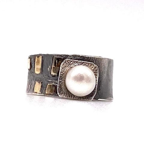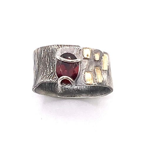 Tämä sormus on peräisin rajoitetusta Mosaic-kokoelmasta, suunniteltu ja valmistettu Alexandra Steinforthin (Ale jewels) toimesta, koru- ja taidetaiteen lisensoinnilla. Se on täysin käsin valmistettu ja käsin veistetty kappale, joka yhdistää teksturoidun hopean kauniiseen 8x6 mm topaasiin sekä toisen osan, jossa on kulta-levyn yksityiskohtia. Se on nykyaikainen muotoilu, ihanteellinen jokaiselle tilaisuudelle ja korutaiteen sekä jalokivien ystäville ainutlaatuinen ja poikkeuksellinen. Etuosan maksimileveys on 12 mm, ja sormus on säädettävä, peruskoko 17/18.Toimitetaan sertifioituna ja vakuutettuna, seurantanumeron kanssa, lahjarasian kanssa sekä taiteilijan tiedoin, jotta se saavuttaisi vastaanottajansa turvallisesti.