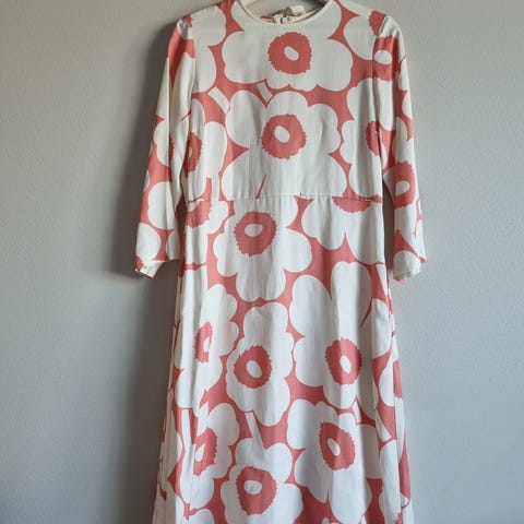 Marimekon kaunis ja tyylikäs vihjaus unikko mekko. 100% miellyttävä ja kauniisti laskeutuva viskoosi. Tiputetut hartiat, 3/4 huhat, kaunis narukiinnitys takana ja suora malli. Koko 38. Kai-kai 61cm, olka-helma 102cm. Erinomainen kunto.