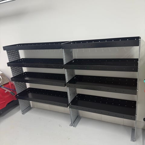 System Edström hyllystö ja työpöytä pakettiautoon metallinen vihreä/harmaa. Kokonaisuuteen kuuluu useita metallihyllyjä, vetolaatikoita, reikälevyjä työkalujen ripustamiseen sekä työpöytätaso. Järjestelmä on suunniteltu asennettavaksi pakettiauton tavaratilaan ja soveltuu esimerkiksi työkalujen, tarvikkeiden ja pienten osien säilytykseen ja järjestelyyn liikkuvassa työpisteessä. Olleet mb sprinterissä