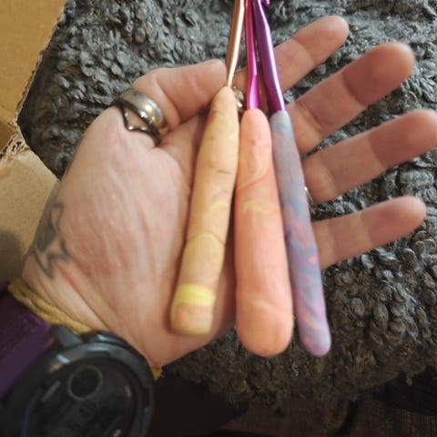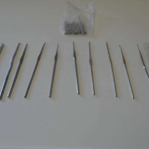 12 kpl virkkuukoukkuja. 1,25, 2, 3, 3 x4, 5, 5,5, 2 x 6, 8 ja valkoisesta en tiedä, kun siinä on eri vahvuiset koukut molemmissa päissä. Myydään yhteishintaan diili tai nouto.